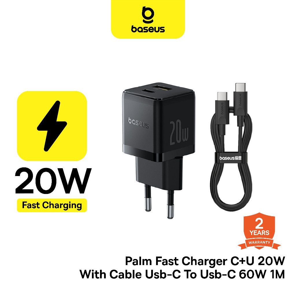 Baseus Set Charger Mini Palm Dual Output C+U 20W EU + Kabel C to C Fast Charging | Quick Charge Dual Port Type C & USB A