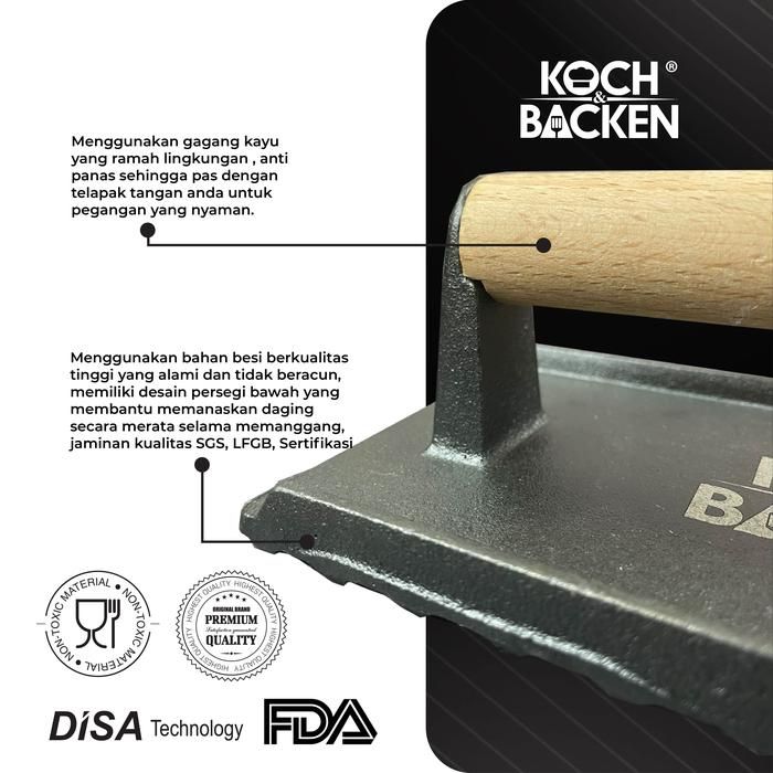 KOCH&BACKEN Cast Iron Meat Press - Alat Press Daging Steak Burger - Garis Premium