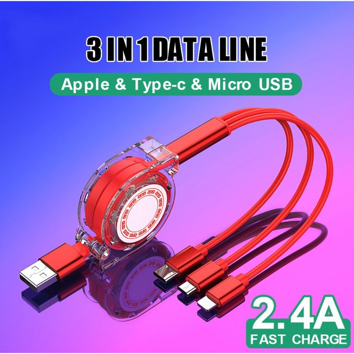 Resong Kabel Stretch roll 3 In 1 2.4A Pengisian Cepat 1 Meter,Kabel Mikro 3 In 1 Dapat Ditarik