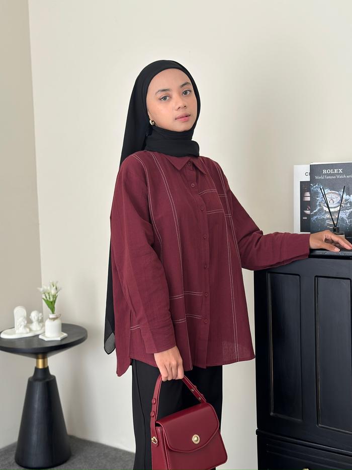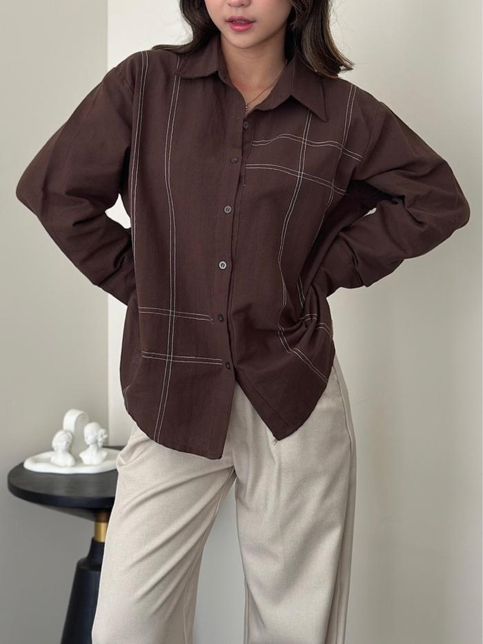 ASOKA Twila Shirt 2289 - Contrast Stitching Oversize Blouse Long Sleeve - Atasan Wanita Kemeja Kasual - White