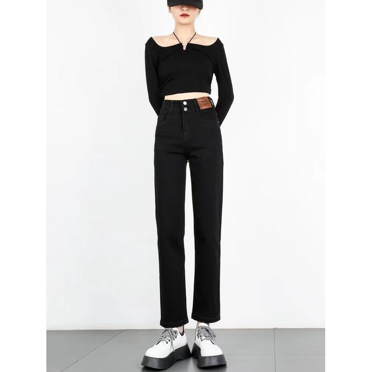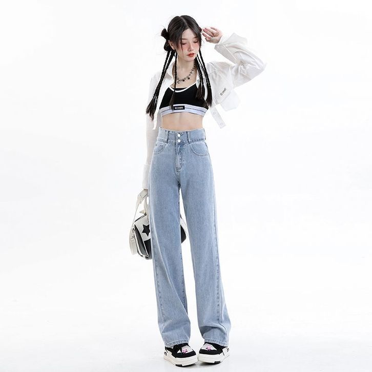 Korean Style Bagy High Waist Straight Loose Cutbray Boyfriend Celana Panjang Jeans Wanita Biru