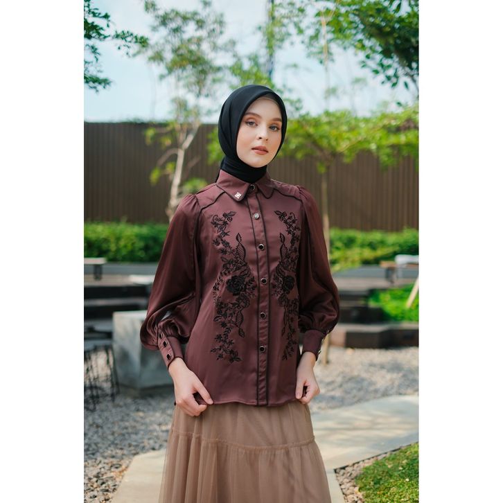 BARU Adeola Scarf - Rose Embroidery Series Blouse - Blouse Bordir - Blouse Wanita - Mahogany udahh