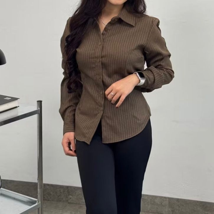 PROMO Kemeja Stripe Wanita Slim Fit Lengan Panjang Motif Garis - Blouse Kerja Elegan Kekinian udahd