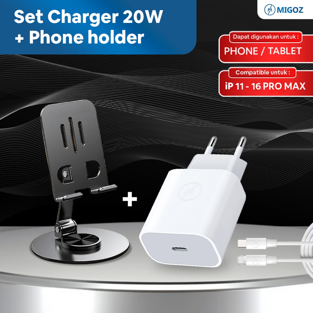 Migoz Charging Stand Kit - Set Charger 20W Fast Charging iPhone 8-14 Pro Max & Phone Holder Metal