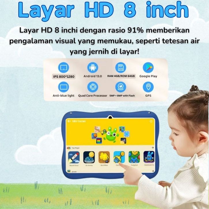 Tablet Anak Android Ram 4/64GB Layar 8 Inch/Tablet Antiradiasi Anak/Tablet Belajar Anak/Kids Tablet Study