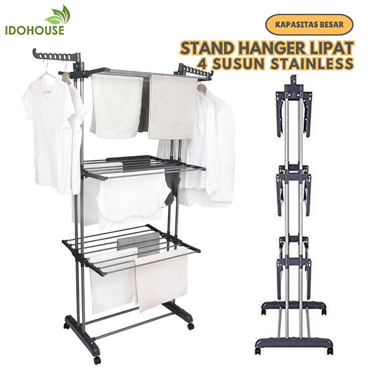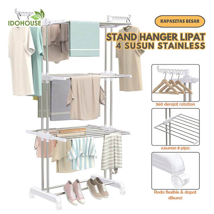 Rak Jemuran Gantungan Pakaian Lipat Baju Handuk Sepatu 24Baris 14 Slot 4Susun Dgn Roda