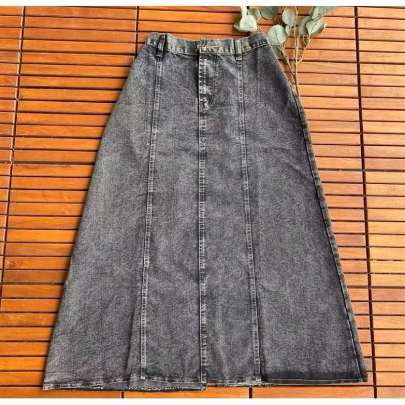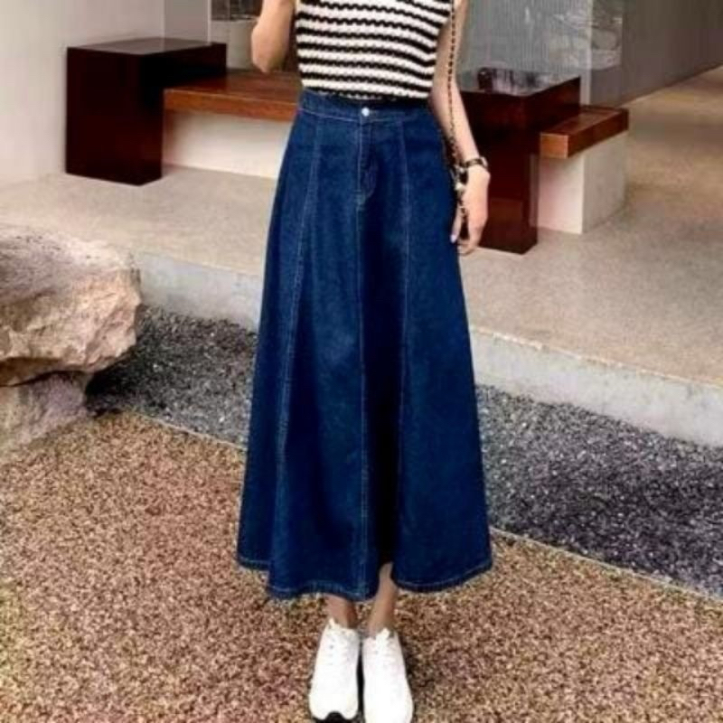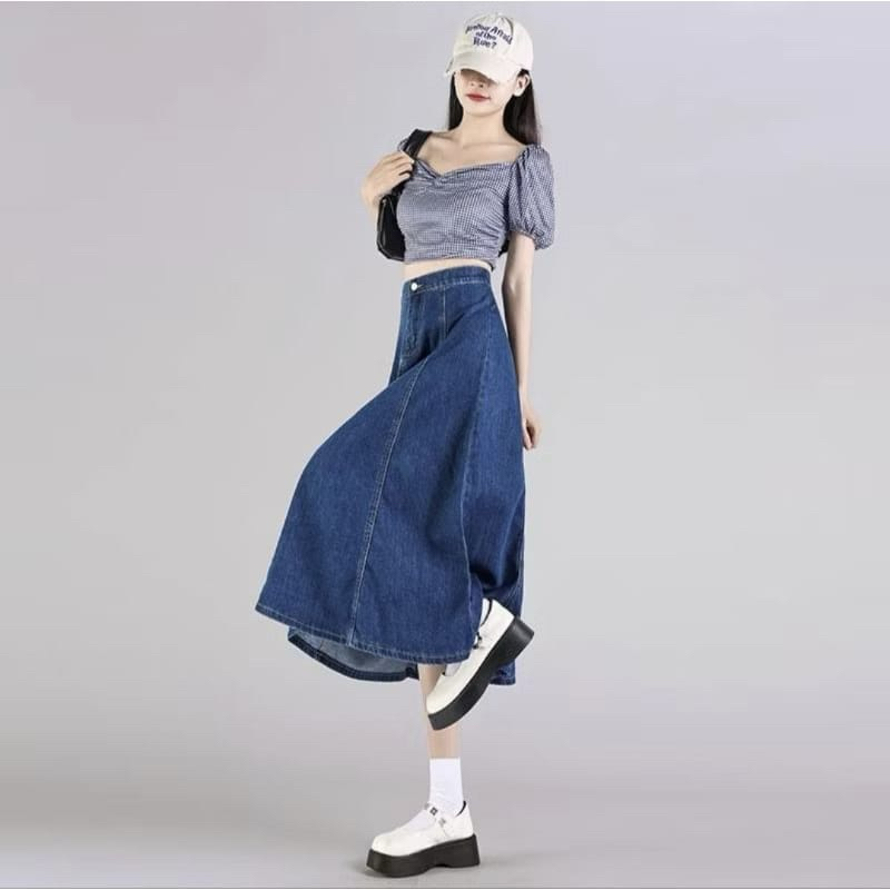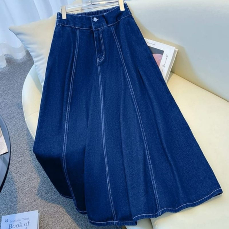 Rok Jisso Jeans Premium Wanita A-Line 7/8 Model Payung Pinggang Karet - Rok Wanita Highwaist Skrit Denim