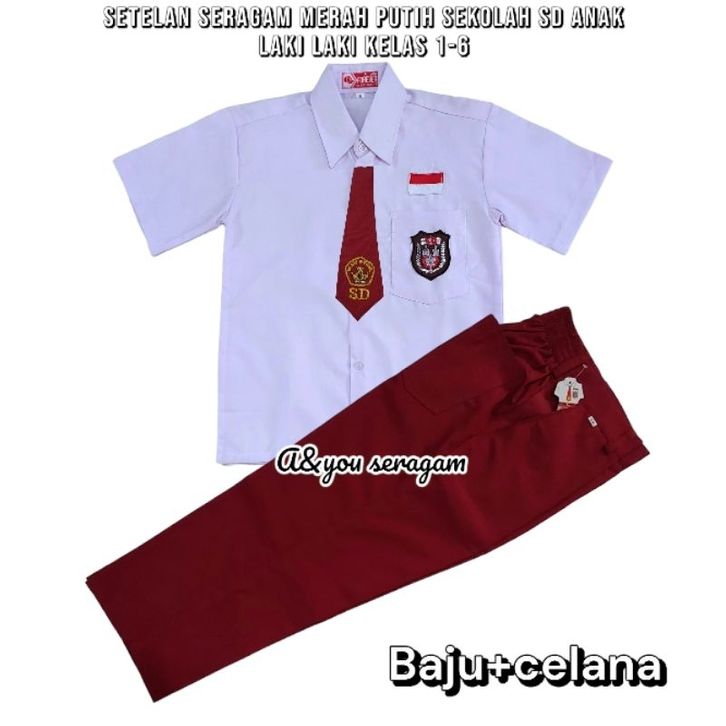 setelan lengkap seragam sekolah SD merah putih laki lengan pendek celana merah panjang pakaian sekolah SD ugick