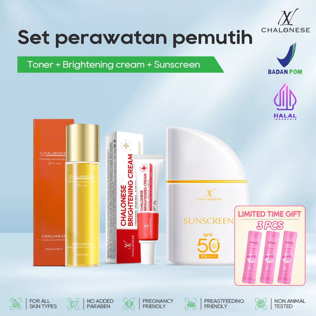 CHALONESE BUNDLING 3 IN 1 FREE MASK STEP TO GLOWING TONER+BRIGHTENNING+SUNSCREENSPF 50 PA +++ MOISTURIZING,MELINDUNGI PAPARAN SINAR MATAHARI Perawatan Wajah