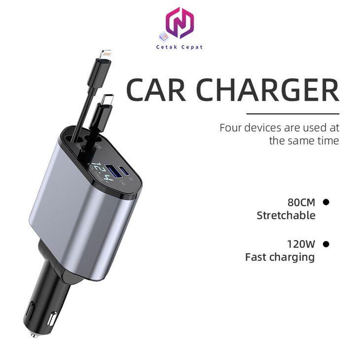 PD 120W Fast Car Charger Rectractable Cable 4 In 1 Type-C & Lightning USB Pengisi Daya Mobil Pengisian Cepat