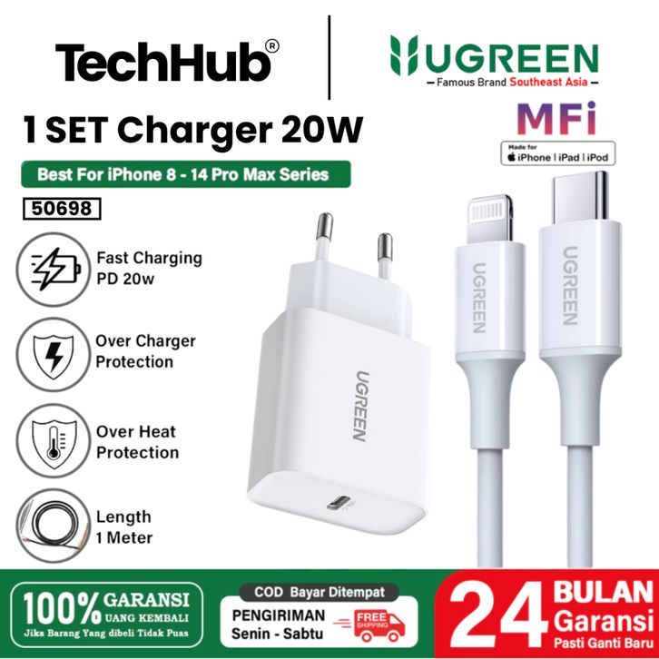 Ugreen Charger iPhone Mfi 20W Type C + Kabel C to Lightning PD Fast Charging