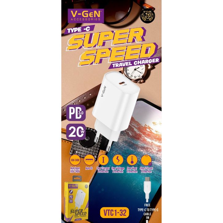 V-GeN Kepala Charger Android IPhone Port Type C 20W Fast Charging QC3.0 PD VTC1-32