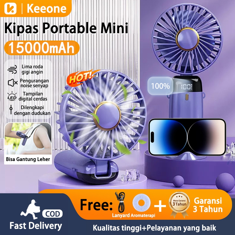 TERLARIS KEEONE KIPAS ANGIN MINI PORTABLE USB 15000 MAH KIPAS LIPAT LEHER 5SPEED WIND LED DISPLAY DENGAN AROMATE