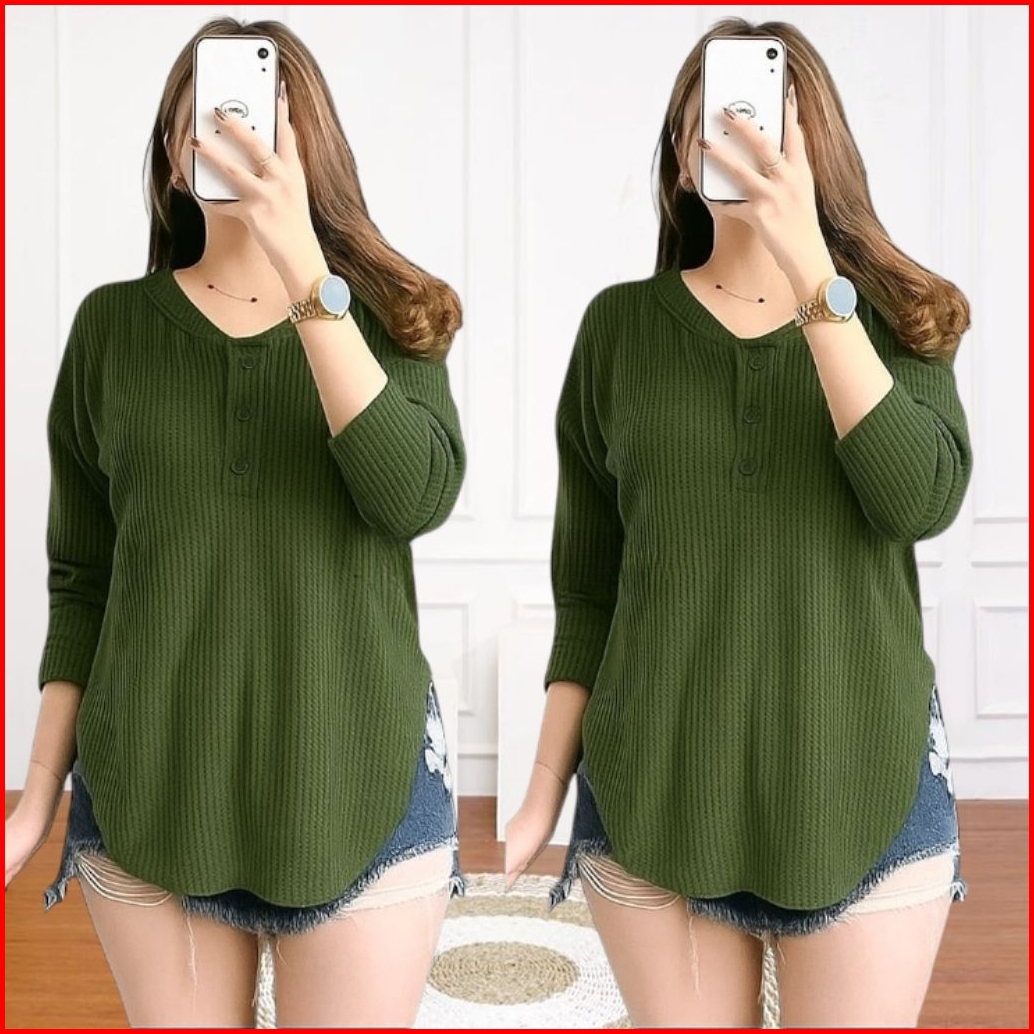 Blouse Atasan Knit Waffle Wanita Lengan Pajang Kaos Polos Bahan Waffle Wanita Kancing 3