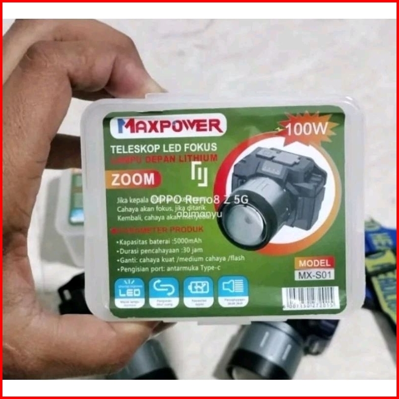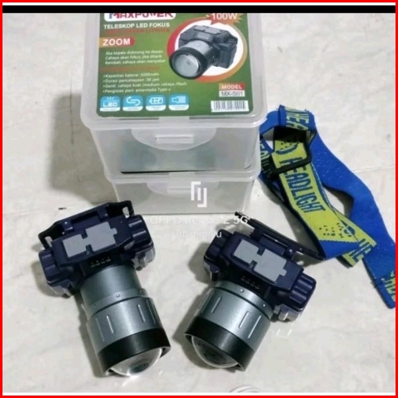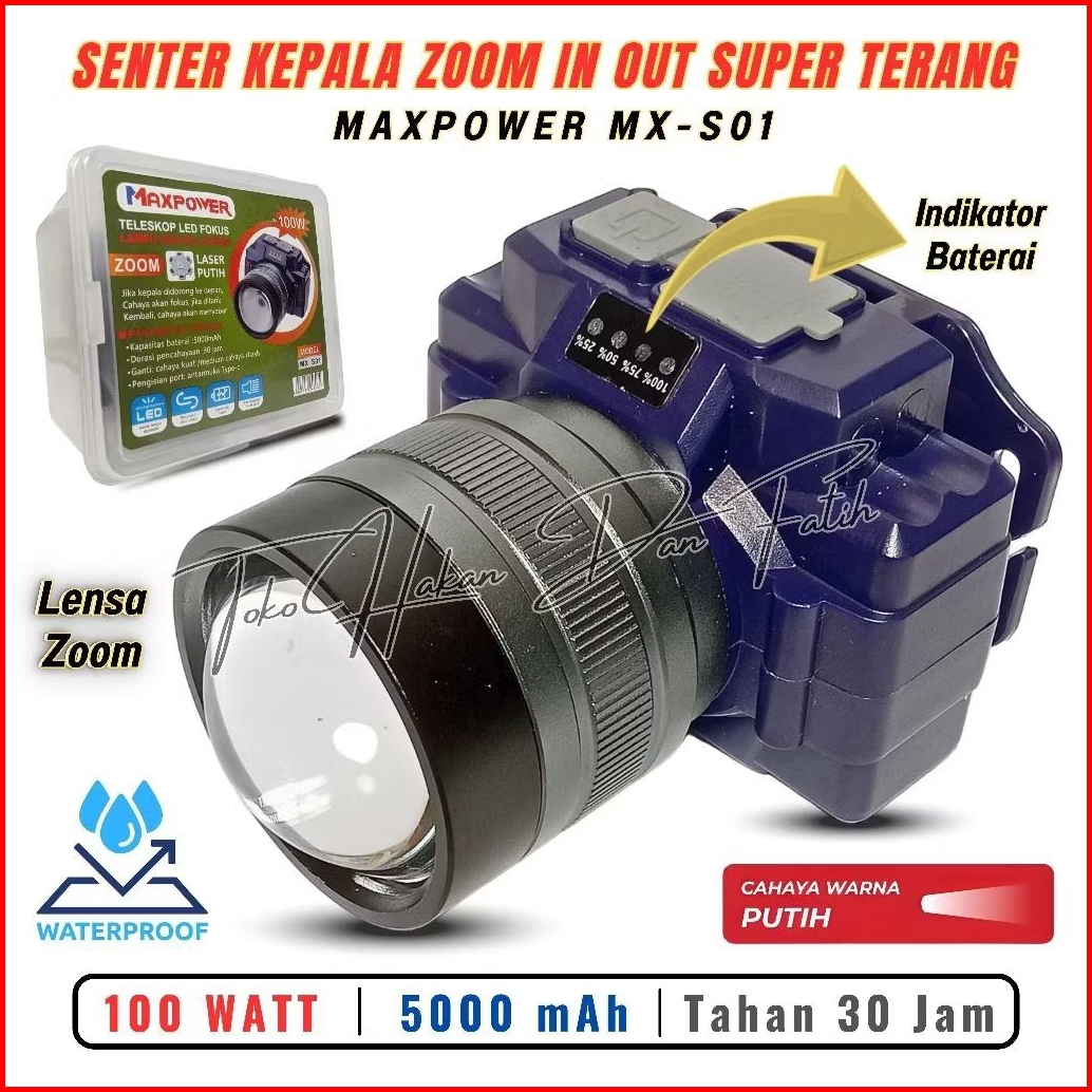Senter Kepala Laser Zoom Mx-s01 Mx-s08 Maxpower Luby Amason Cahaya Purnama Putih 100watt Tahan 30 Jam Maksimal Plus Rech