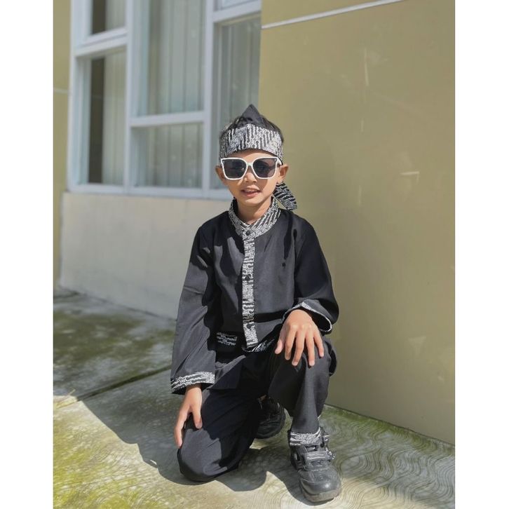 baju adat anak laki laki Baju setelan pangsi anak gratis iket kepala motif batik hitam putih terlaris