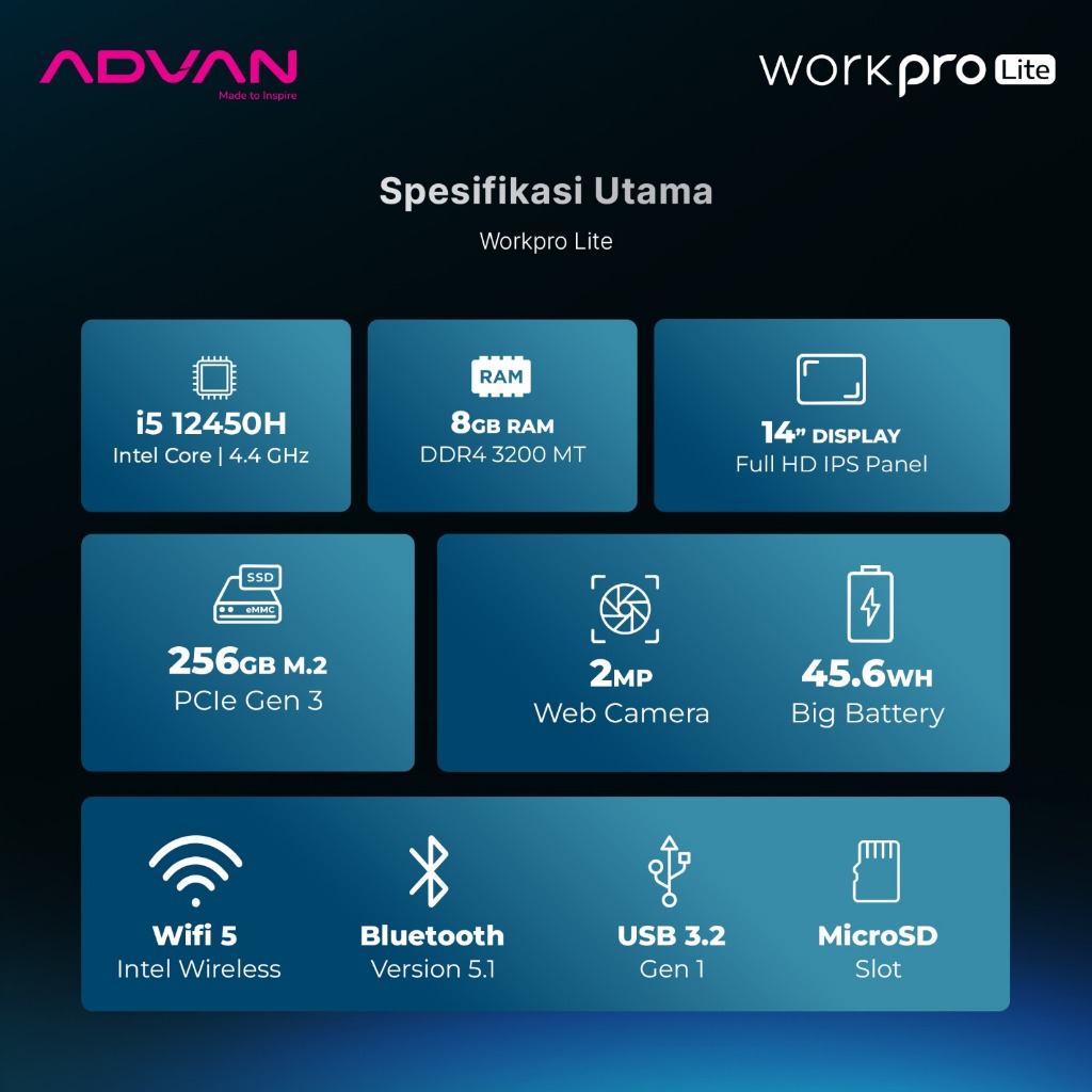 [BEST DEALS] ADVAN LAPTOP WORKPRO LITE | INTEL CORE I512450H | INTEL CORE I3 1220P | 8GB256GB | IPS FHD | WIFI 5 | WINDOWS 11 | GARANSI RESMI 1 TAHUN