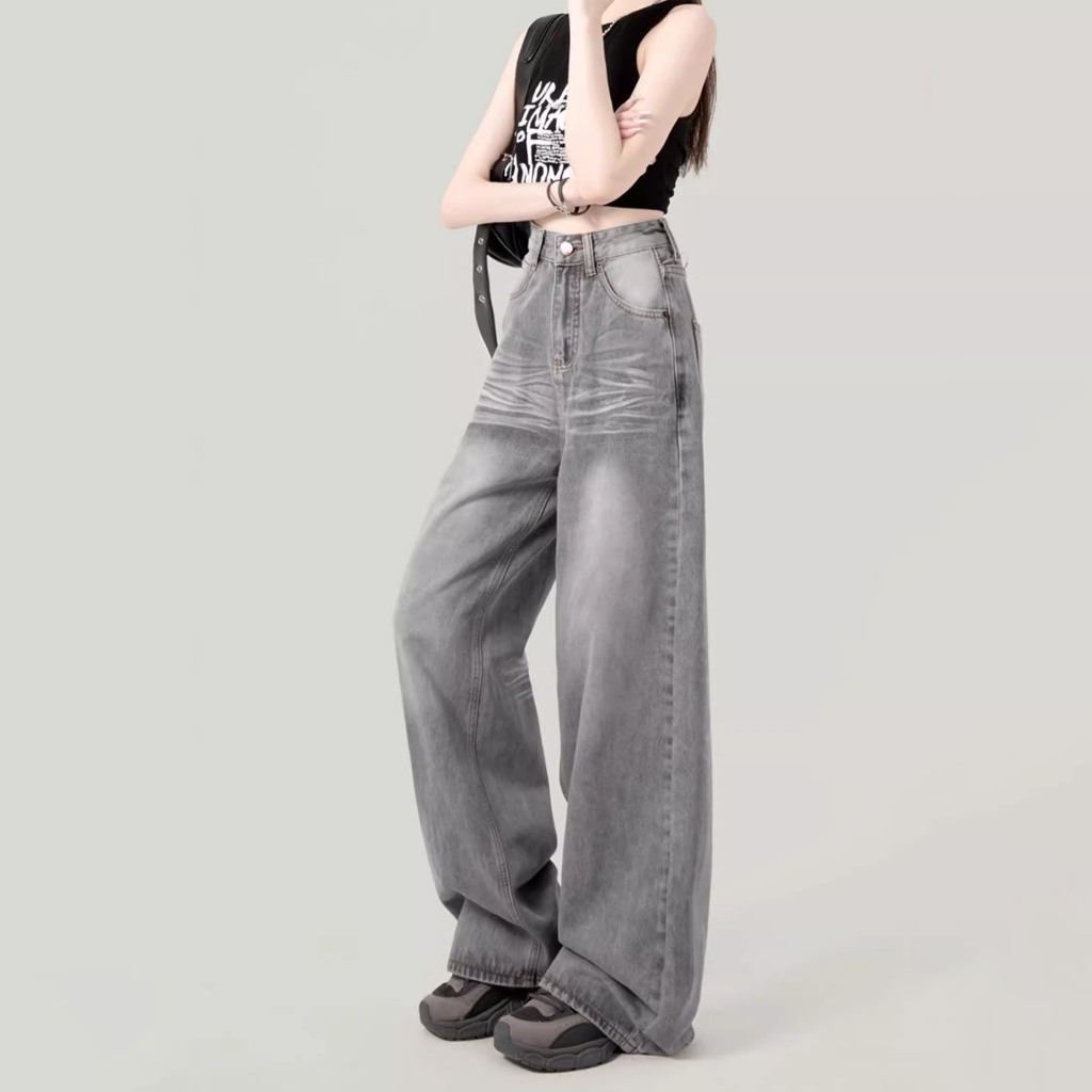 2025 Baru Abu abu Highwaist Fashion Baggy Celana Jeans Cewek Style
