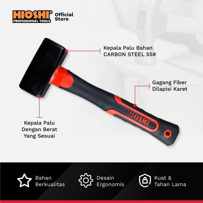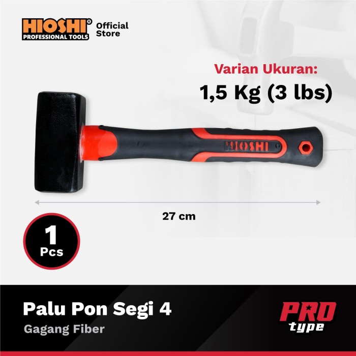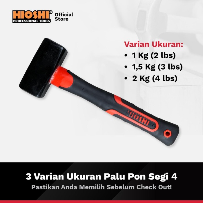 HIOSHI Palu Pon Martil Bodem Petil Batu Segi4 Gagang Fiber Karet 2lbs 3lbs 4lbs 1kgs 2kgs 3kgs PRO