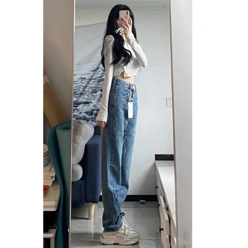 Celana Jeans High Waist Wanita Korean Style Jeans Baggy Pants Serbaguna Kasual Biru Retro