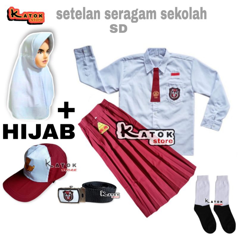 Setelan Seragam Sekolah SD Merah Putih Perempuan Plus Hijab Baju Rok Panjang Lengkap