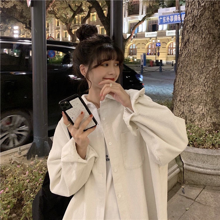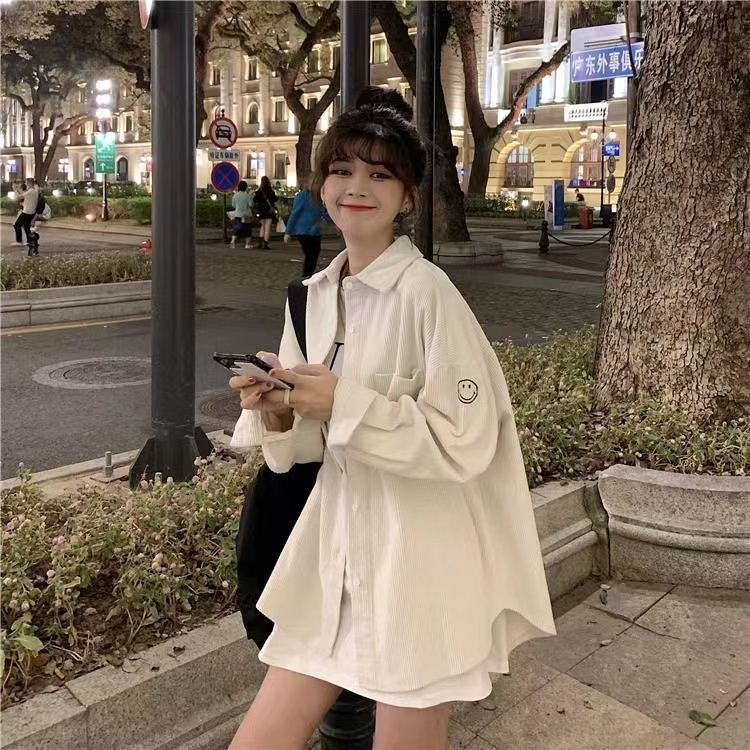 KEMEJA KORDUROI KOREA BORDIR SMILEY LONGGAR KEMEJA KASUAL JAKET