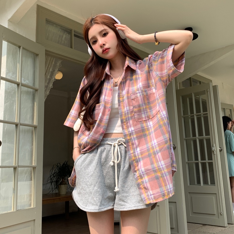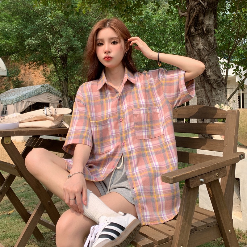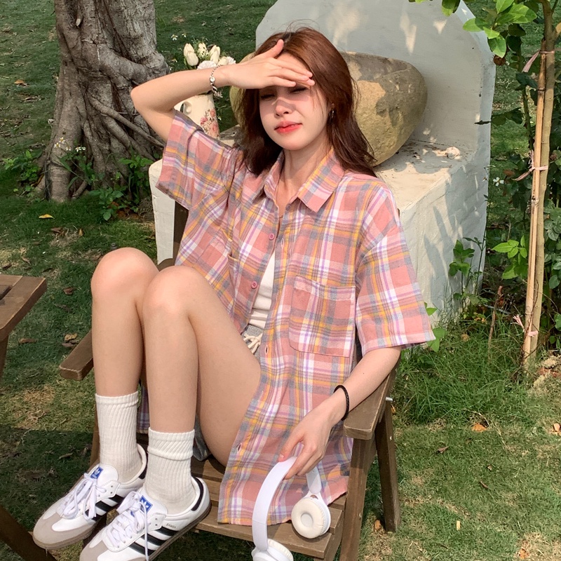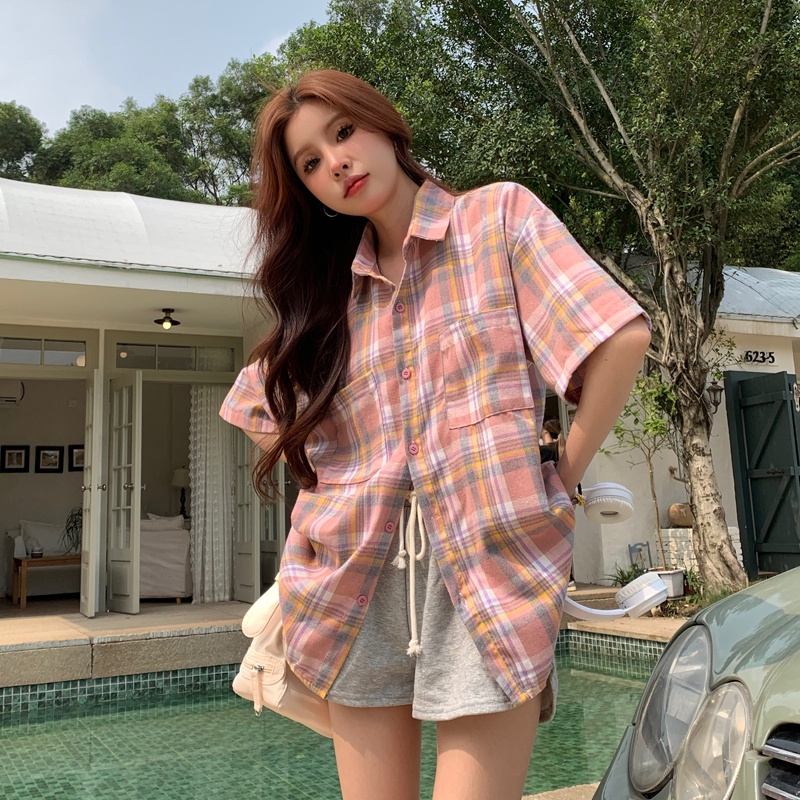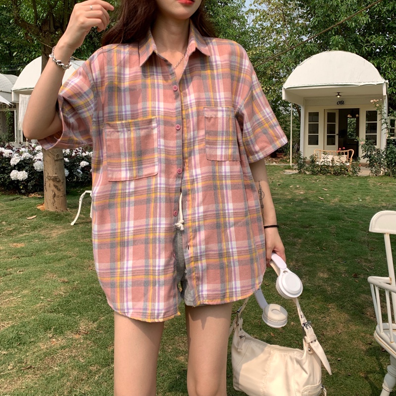 KEMEJA KOTAKKOTAK MERAH MUDA JEPANG KARDIGAN KERAH POLO RETRO ATASAN LENGAN PENDEK SISWA LONGGAR