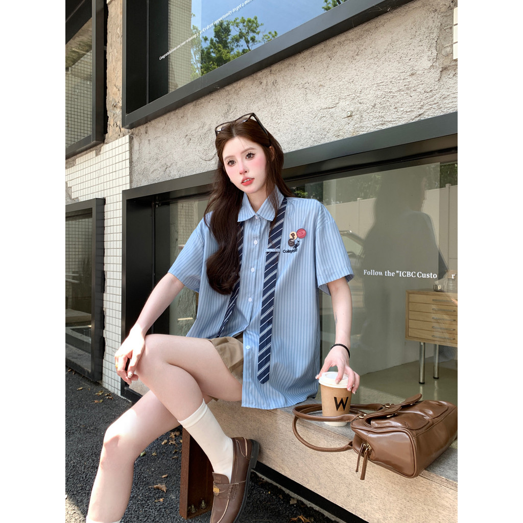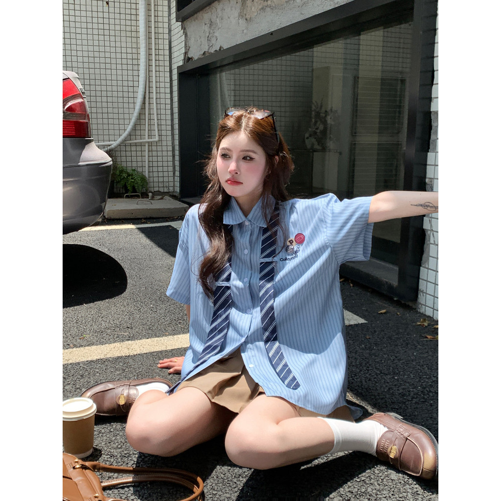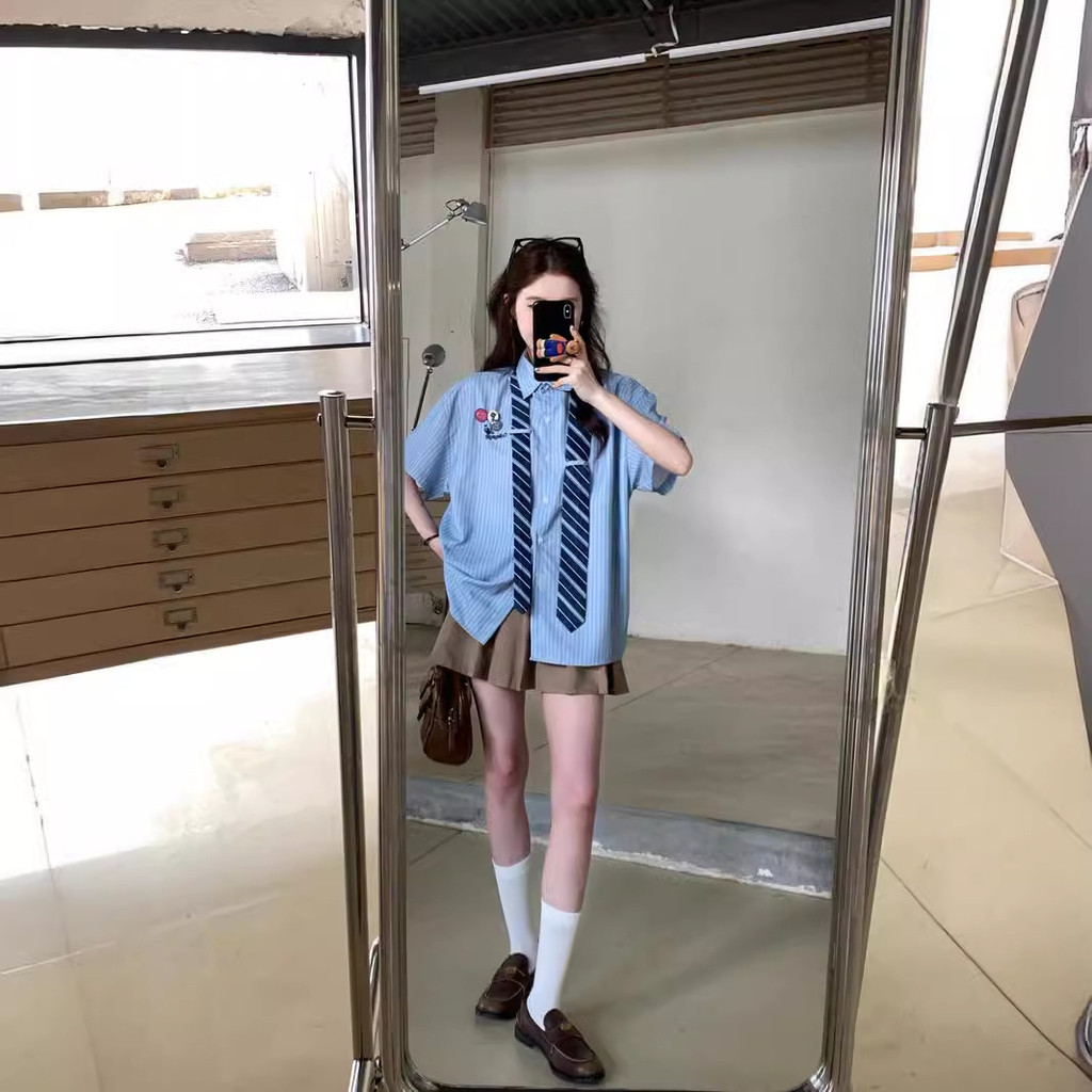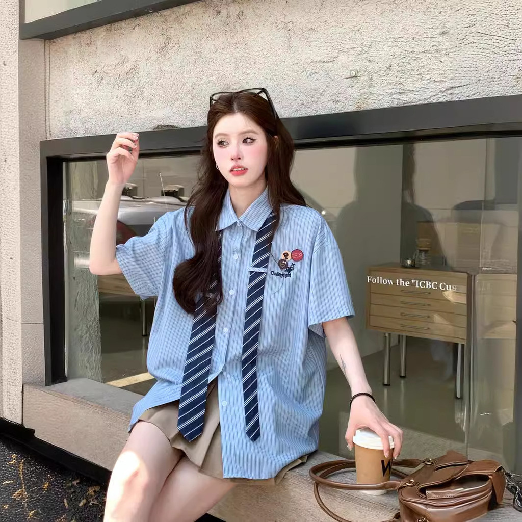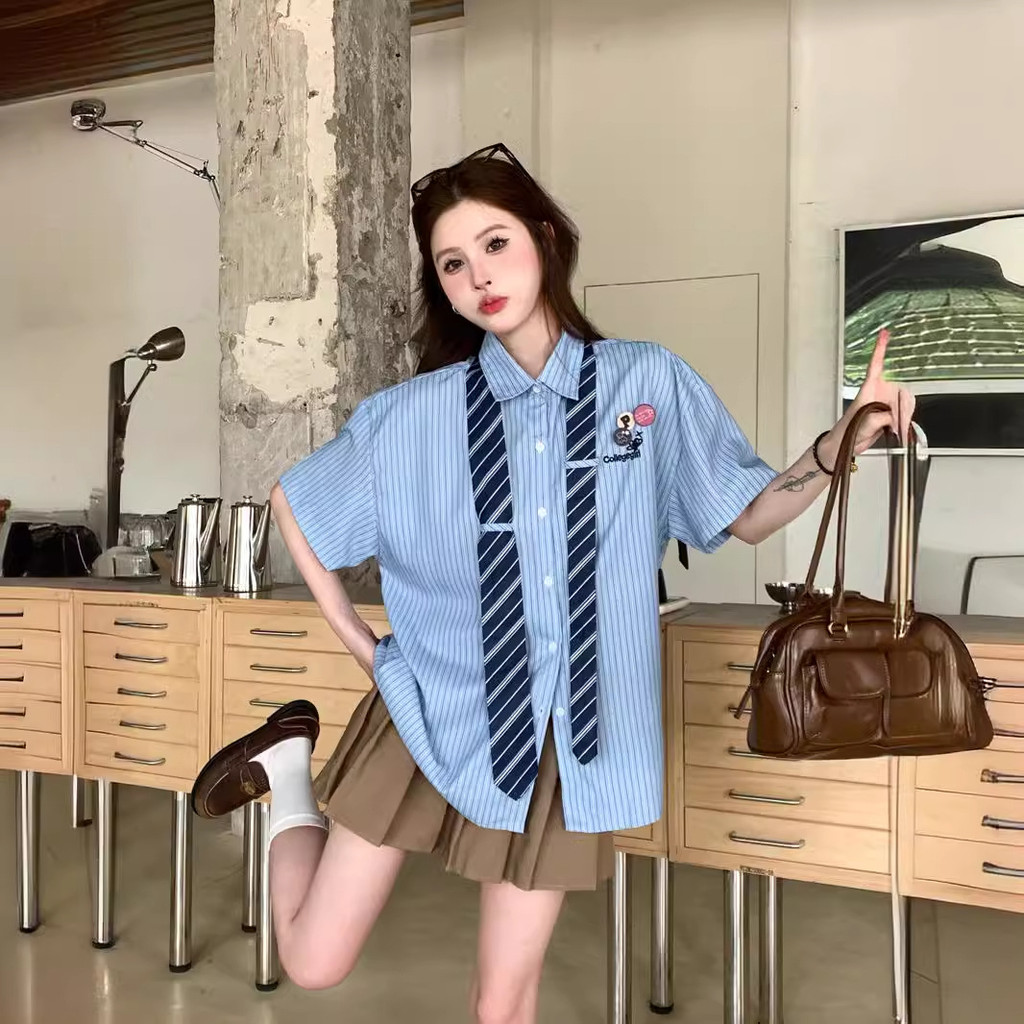 ATASAN KEMEJA LENGAN PENDEK BERGARIS BIRU GAYA KAMPUS RETRO (TERMASUK DASI)
