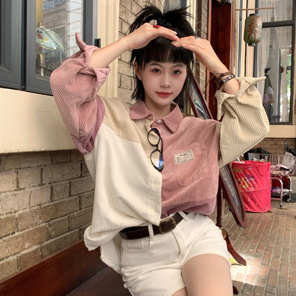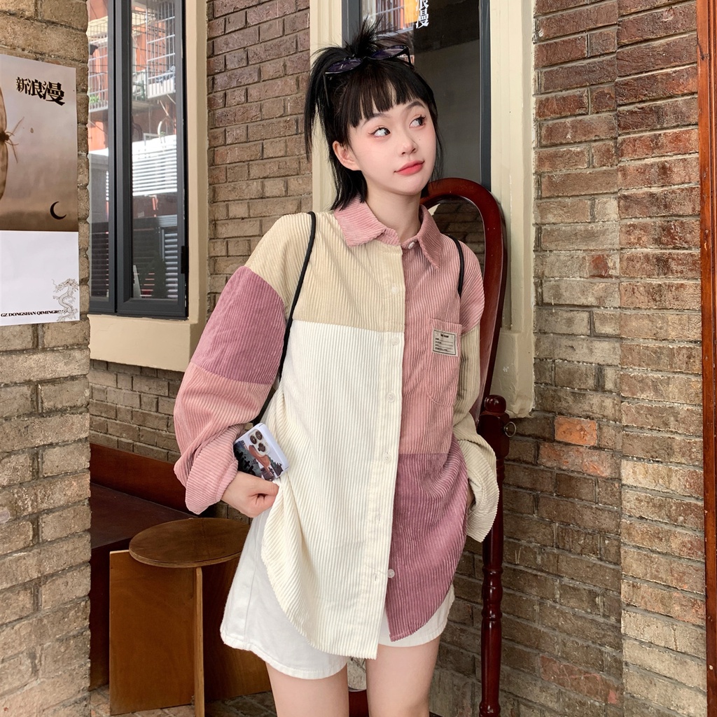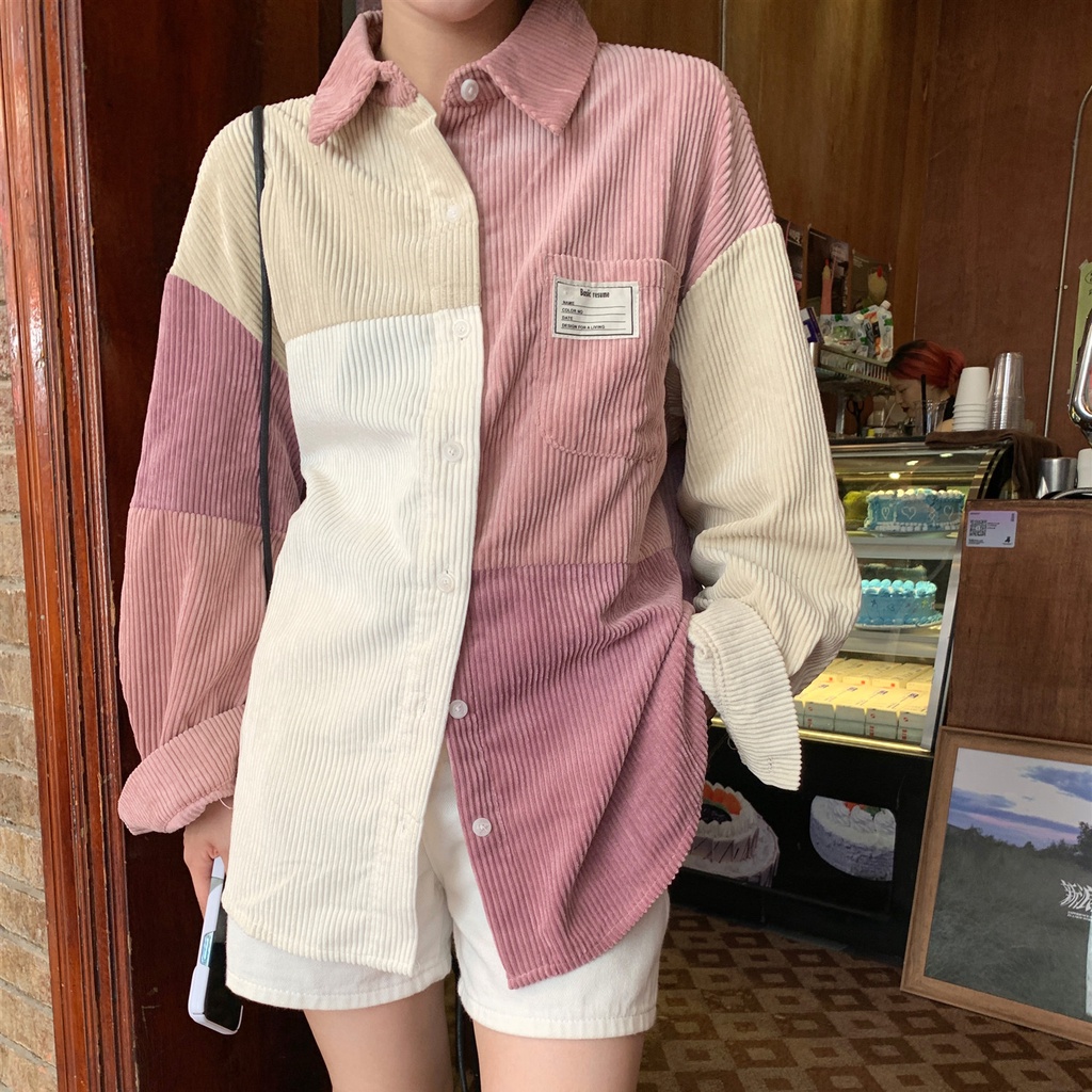 KEMEJA KORDUROI GAYA KOREA JAHITAN WARNA KONTRAS ATASAN LENGAN PANJANG GADIS PINK