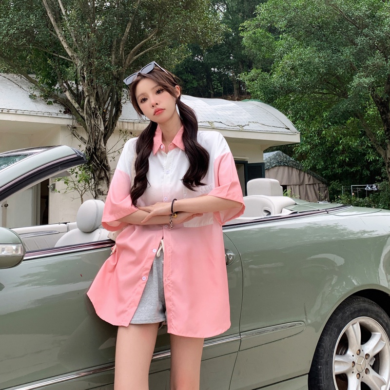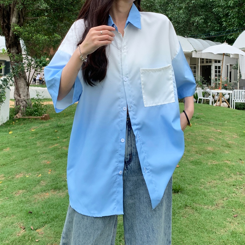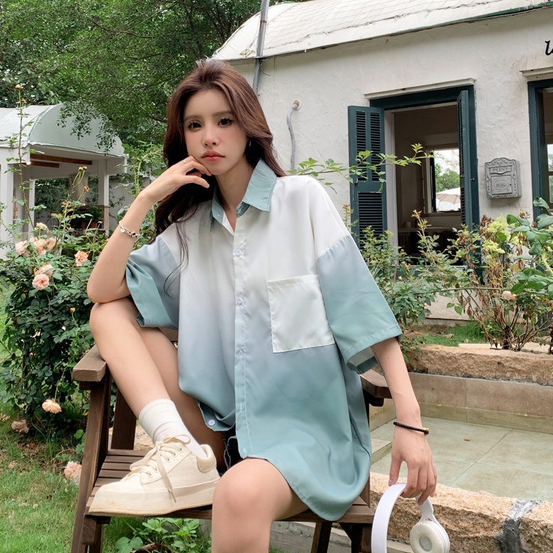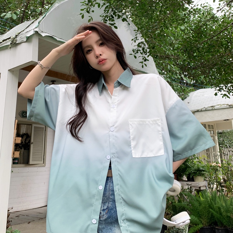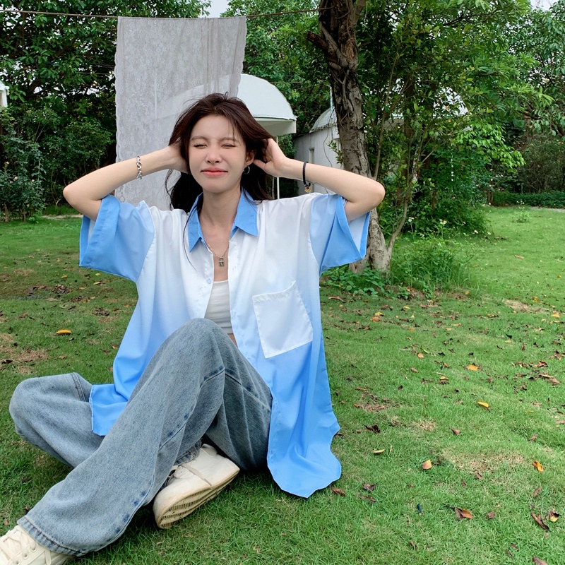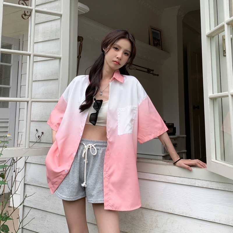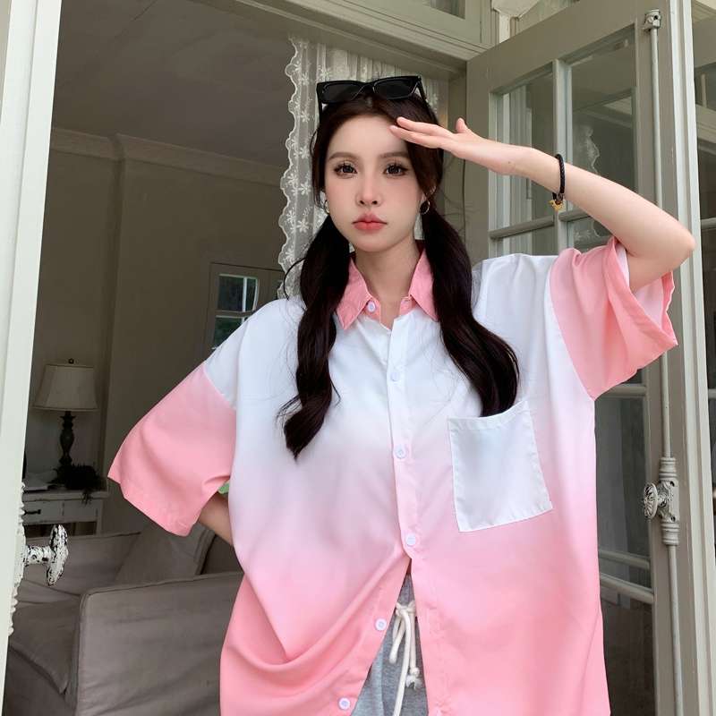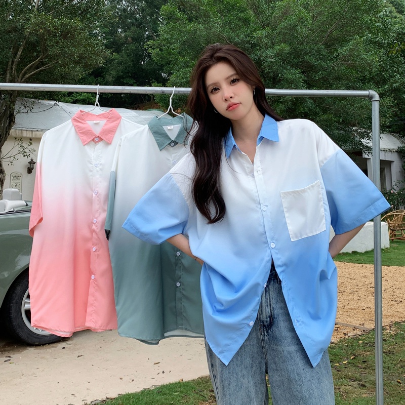 KARDIGAN WARNA GRADIEN KEMEJA LENGAN PENDEK WANITA KEMEJA PASANGAN SERBAGUNA KASUAL LONGGAR