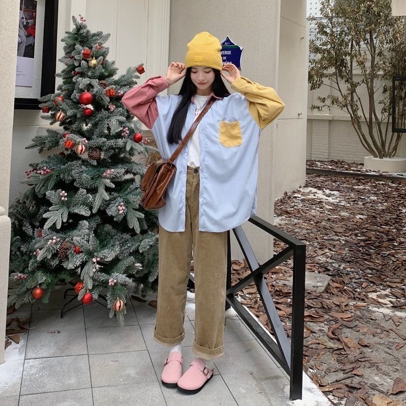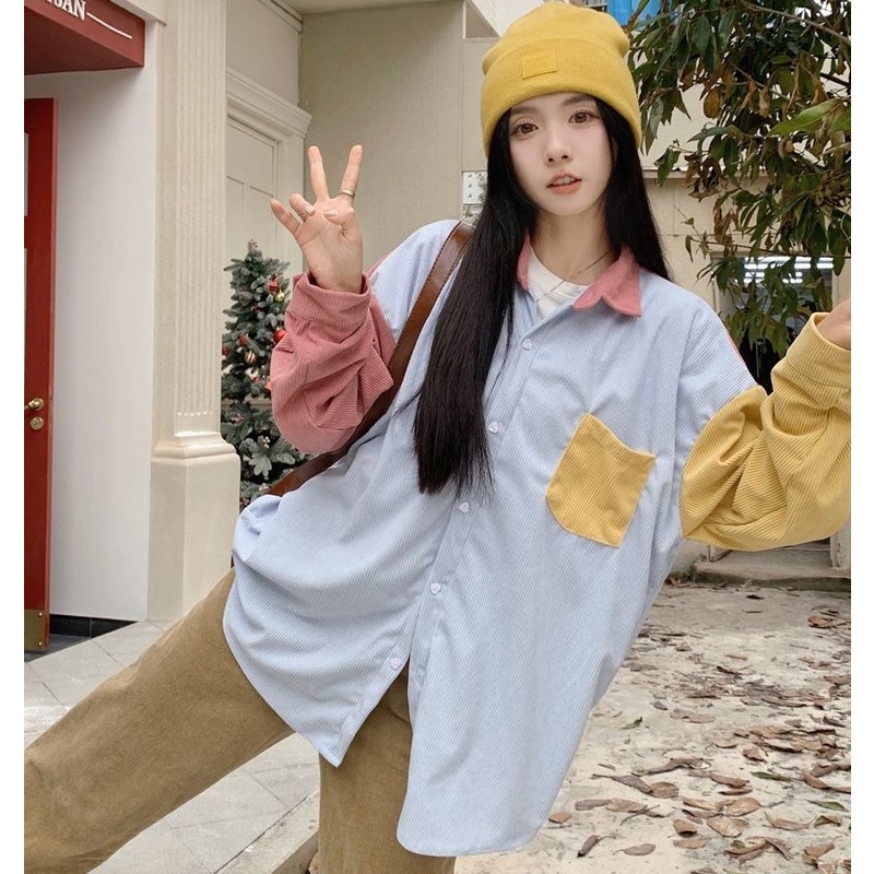 KEMEJA KORDUROI LENGAN PANJANG TAMBAL SULAM WARNA PERMEN MANIS ALA KOREA