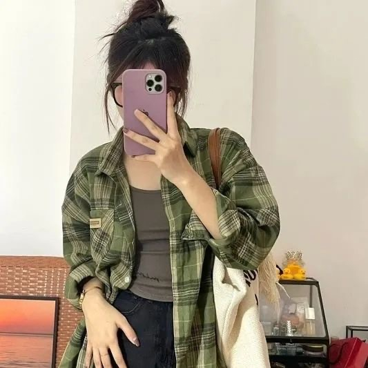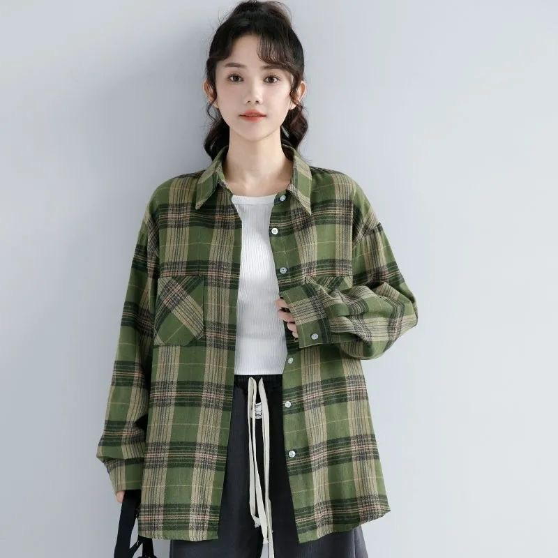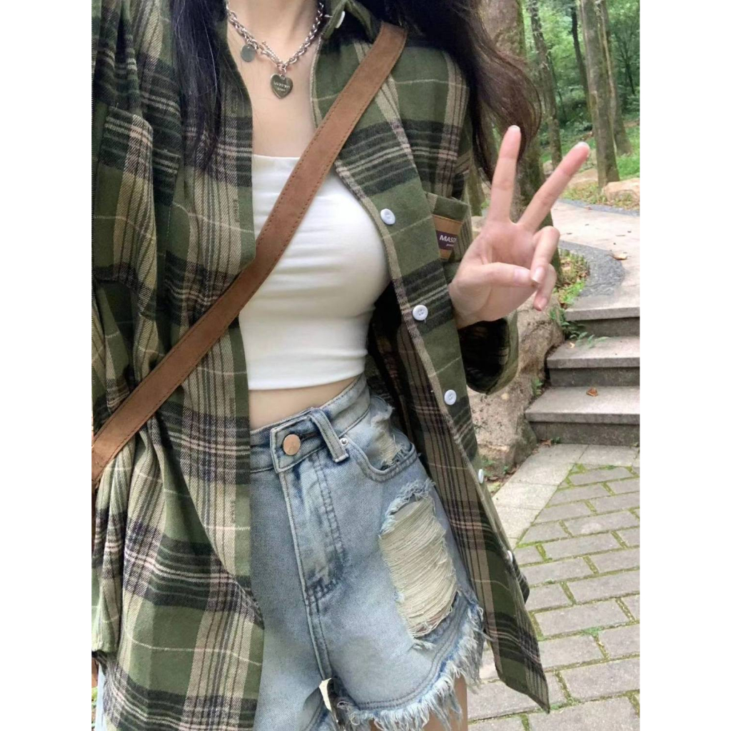 KEMEJA LENGAN PANJANG KOTAKKOTAK HIJAU UNTUK WANITA JAKET KEMEJA KARDIGAN RETRO TRENDI GAYA KOREA