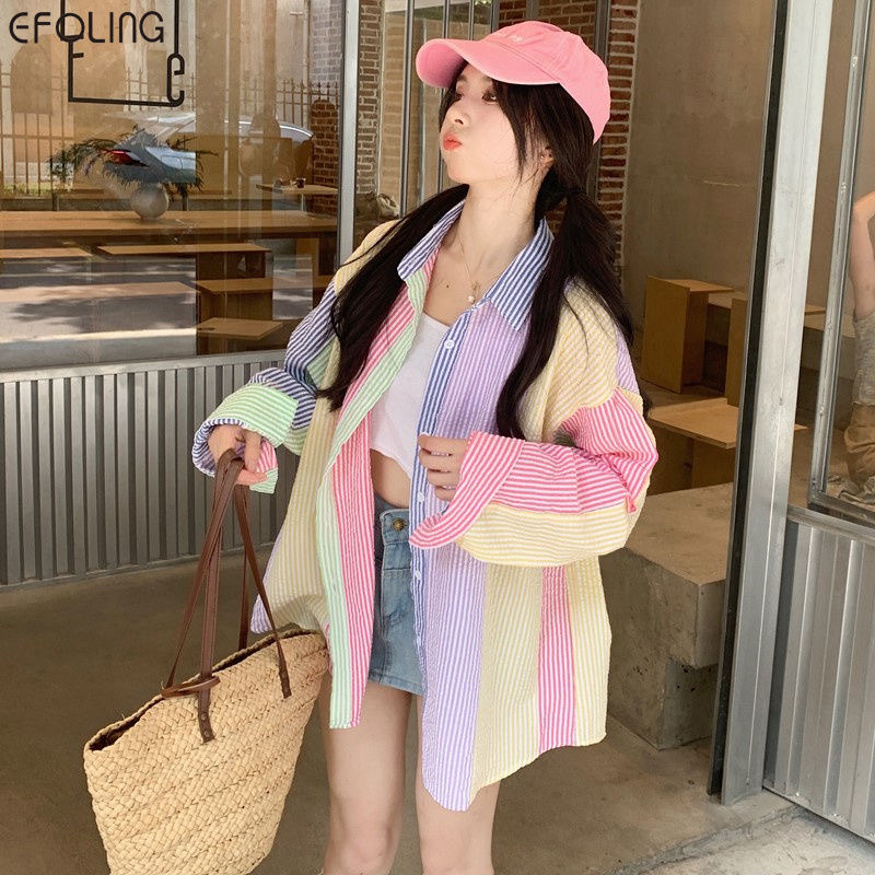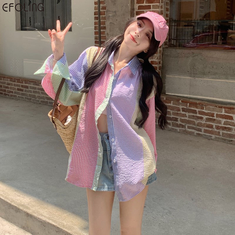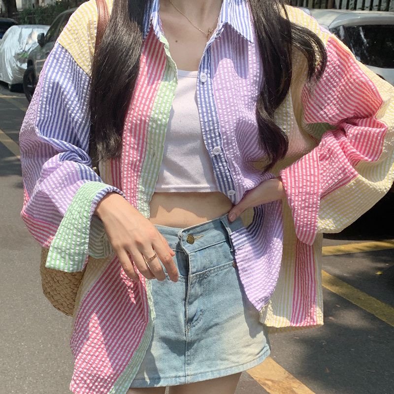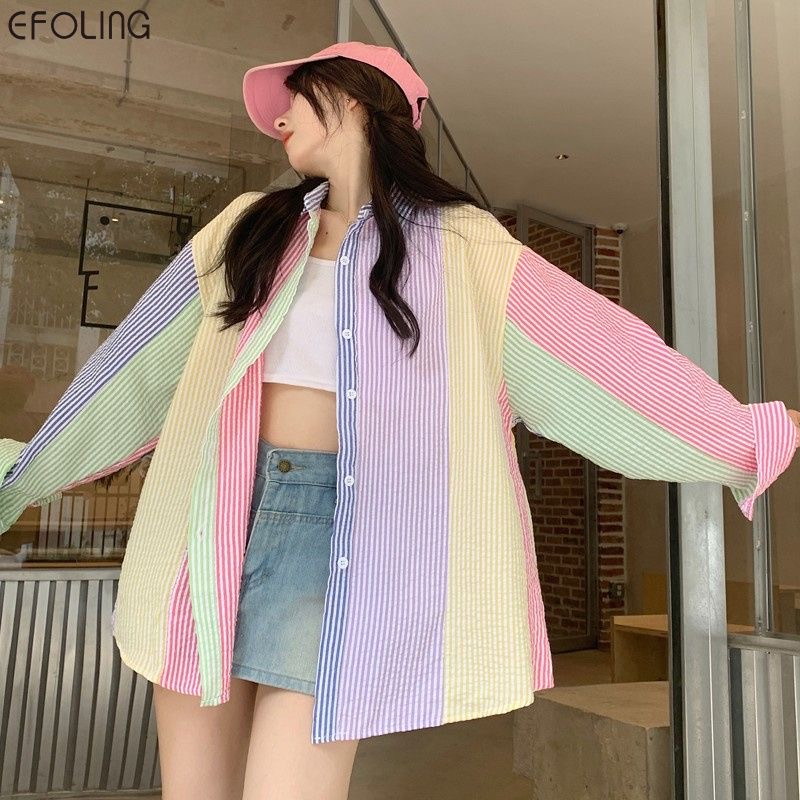 KEMEJA LENGAN PANJANG TAMBAL SULAM BERGARIS MACARON UNTUK WANITA KEMEJA LONGGAR KASUAL DAN LUCU
