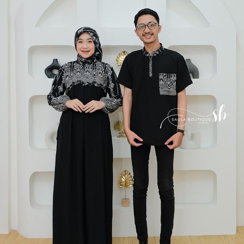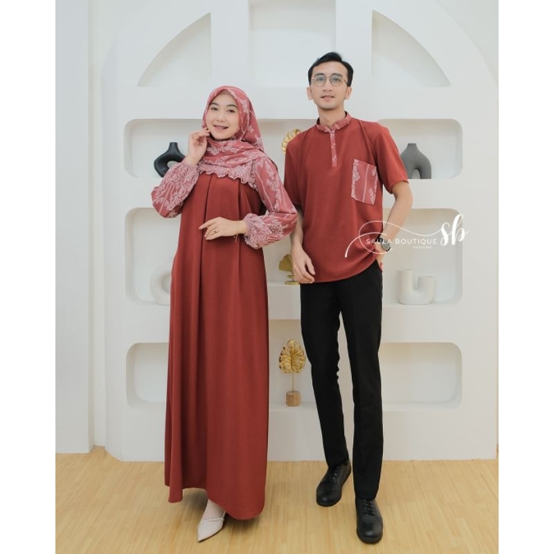 Ready Couple Set Gamis Kanaya dan Kemeja Keenan (PO Pengkuningan) Bahan Cringkle mix Ceruty Printing Motif Terlaris- Baju Couple Lebaran - Sarimbit Set Gamis dan Koko - Dress Couple Free Hijab
