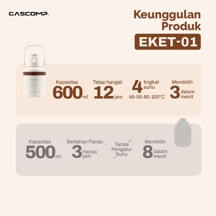 GASCOMP Elektric Tumbler Portable Stainless 600mL EKET-01 | Botol Minum Tahan Panas & Dingin, Food-Grade , Low Watt 550W