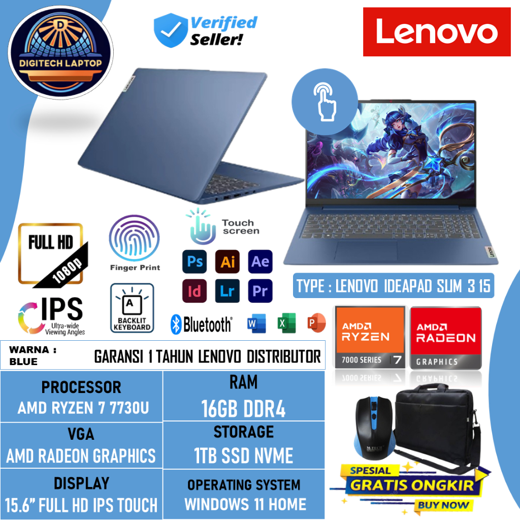 Laptop Touchscreen Lenovo Ideapad Slim 3 15 Amd Ryzen 7 7730U 16GB 1TB SSD 15.6 Inch FHD Win 11 Home