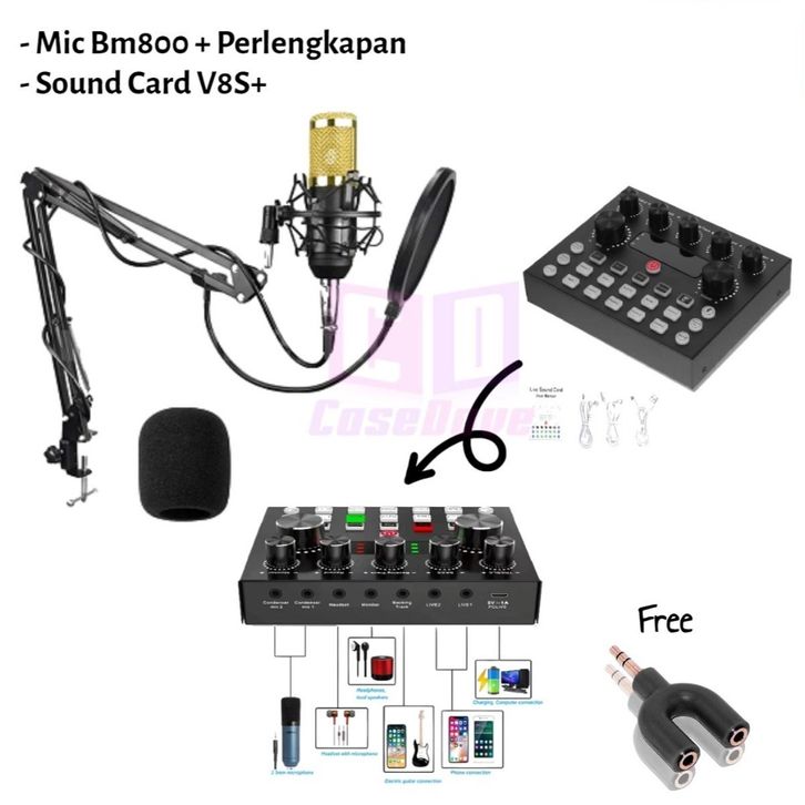 PAKET LENGKAP MICROPHONE CONDENSER FULL SET MIC CONDENSER PODCAST BM 800 + STAND + POP FILTER + SOUNDCARD V8S V8S PLUS