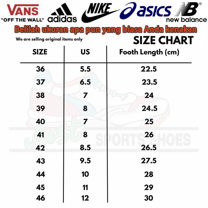 EUR 36 / 22.5cm, EUR 37/ 23.5cm, EUR 38/ 24cm, EUR 39/ 24.5cm, EUR 40 / 25cm, EUR 41 / 26cm, EUR 42 / 26.5cm, EUR 43 / 27.5cm, EUR 44 / 28cm, EUR 45 / 29cm