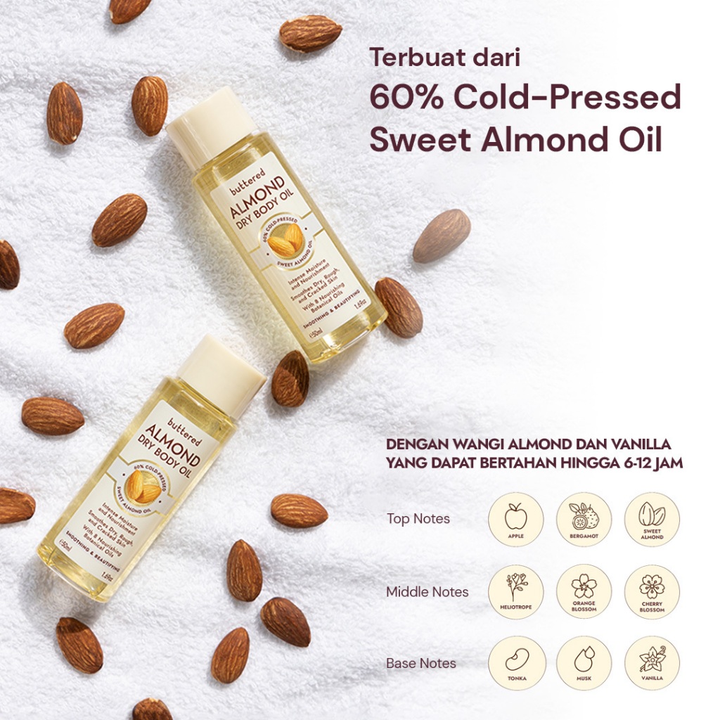 BUTTERED ALMOND DRY BODY OIL 60 PERSEN COLD PRESSED SWEET ALMOND OIL VITAMIN E DAN ANTIOKSIDAN WANGI MEWAH MENYAMARKAN STRETCH