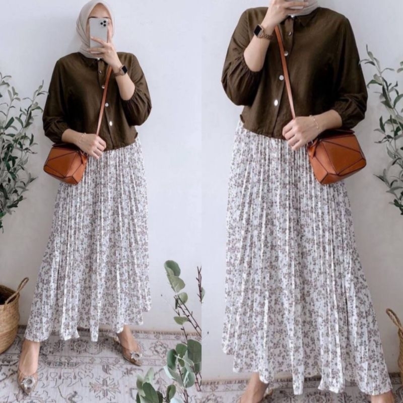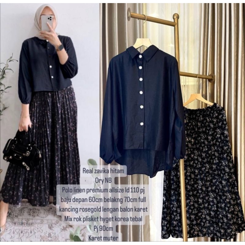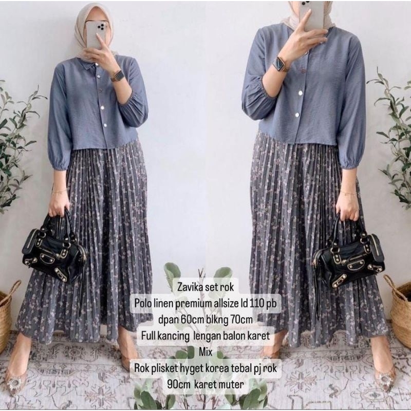 One Set Rok Zavika Oneset Terlaris Kekinian Rok Plisket Wanita Setelan Polo Linen Ld 110cm