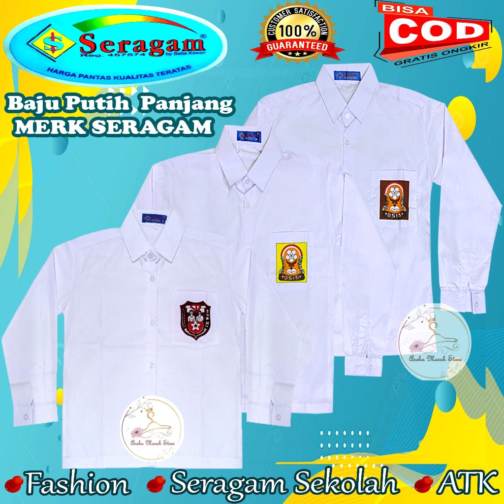 Seragam Sekolah Baju SD SMP SMA Putih Lengan Panjang Pakai Logo Ukuran 7 sampai 20 Merek Seragam