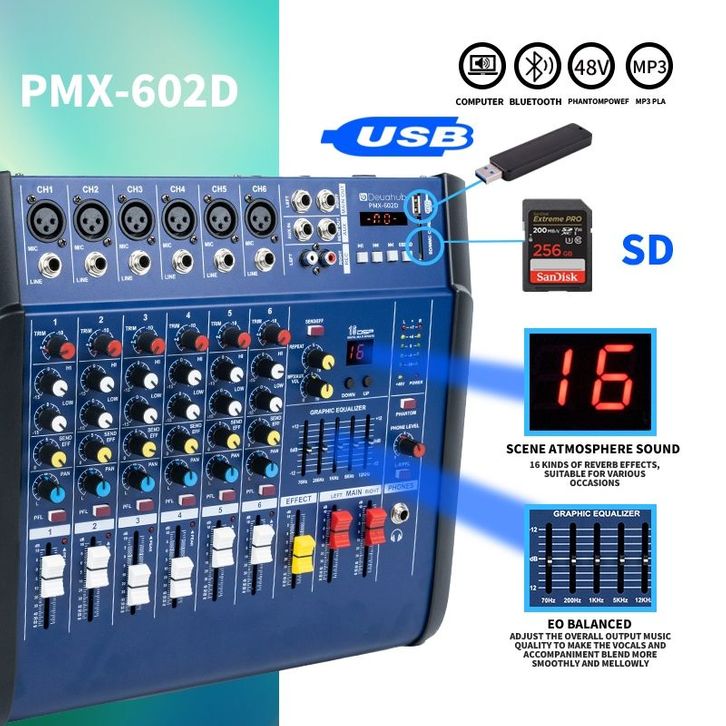 Deuahub PMX4/602D mixer amplifier with equalizer 4/6-channel built-in EQ/recording Suport bluetooth