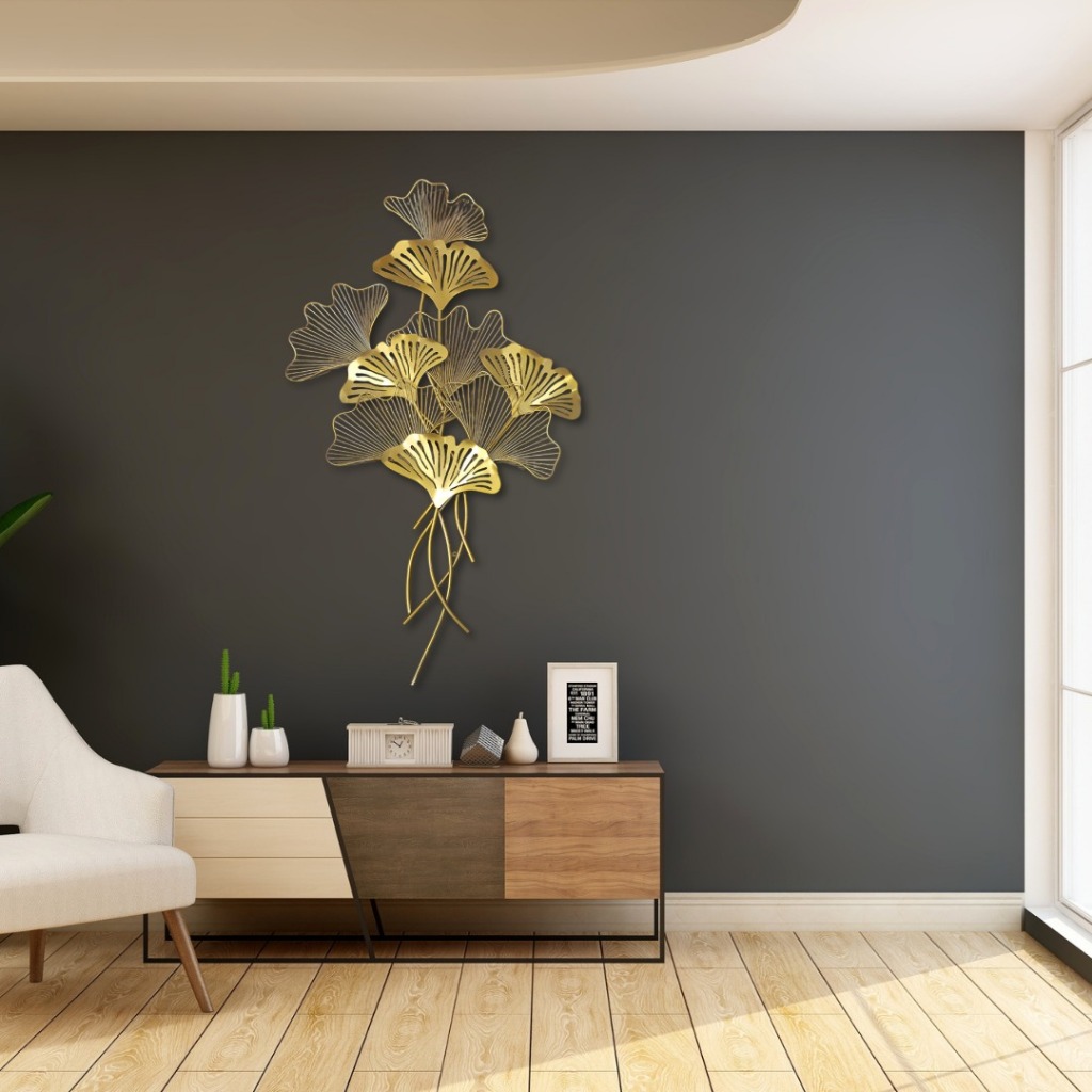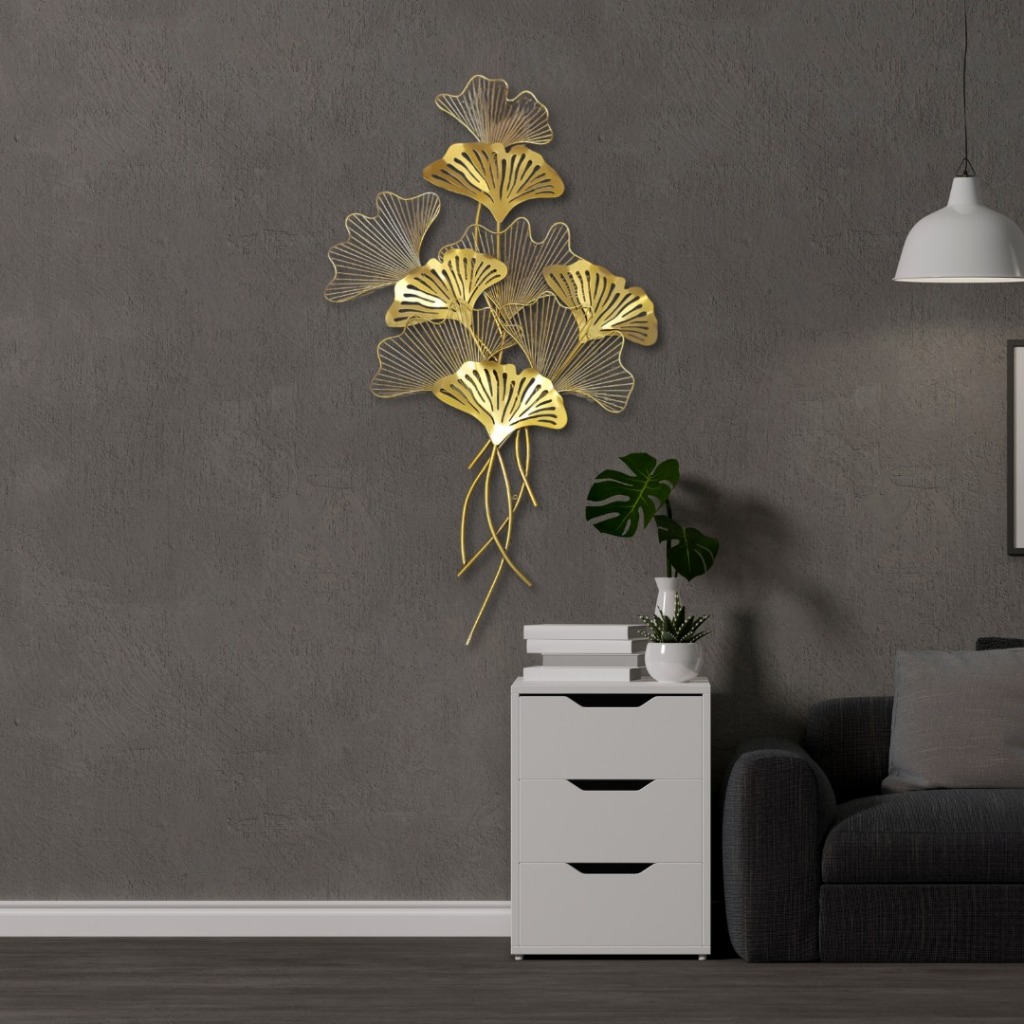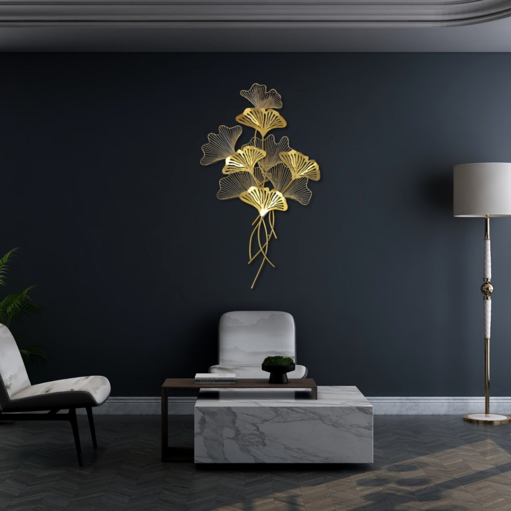 Hiasan Dinding Daun Gingko Stainless Emas Desain Artistik Dekorasi Elegan untuk Rumah dan Kantor