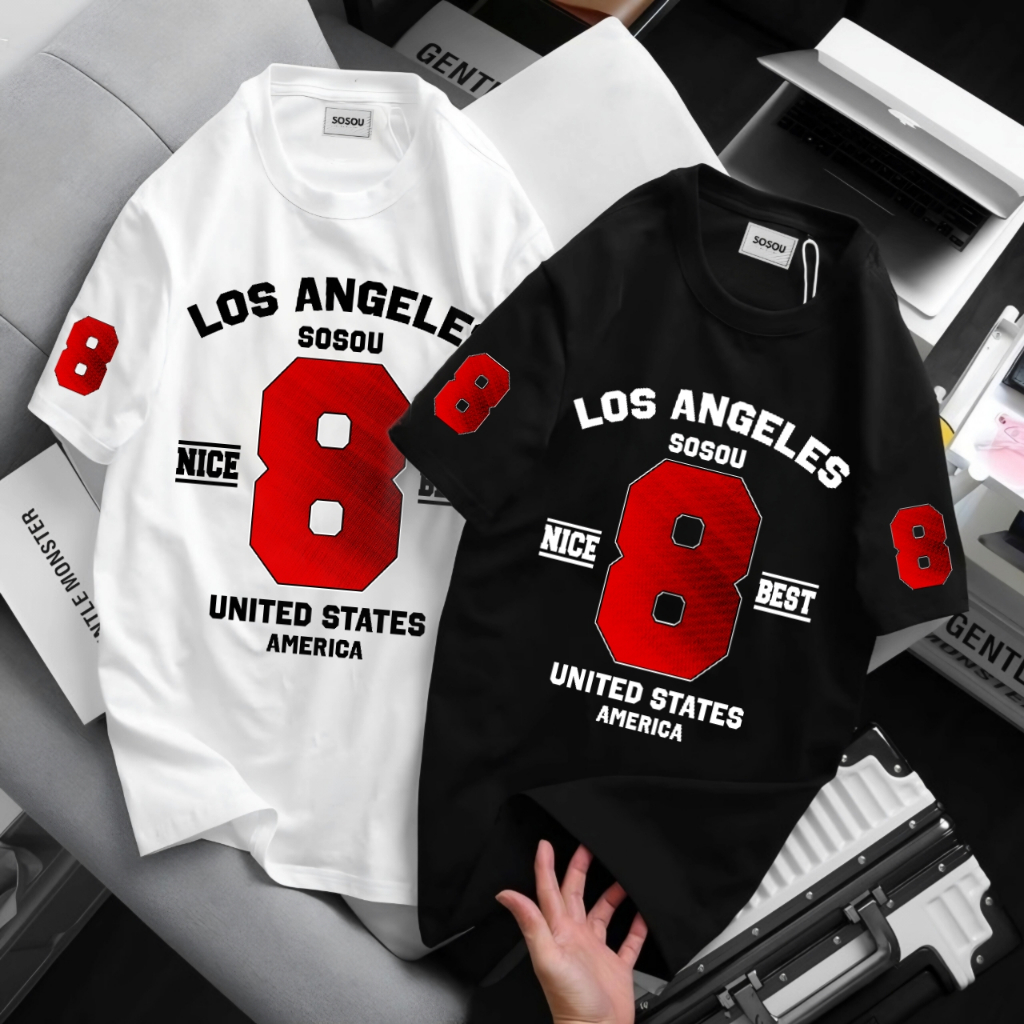 Kaos Pria Wanita Desain Angka 8 LOS ANGELES SOSOU Lengan Pendek Warna Putih Unisex Baju Distro Keren Casual Streetwear