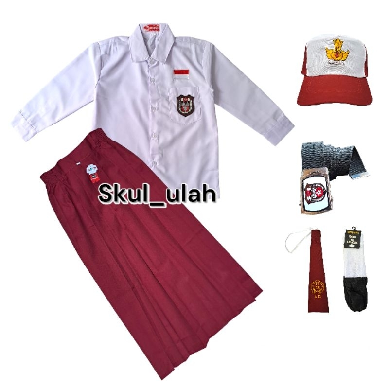 Set Lengkap Seragam Sekolah SD Anak Perempuan Baju Panjang Rok Merah Panjang