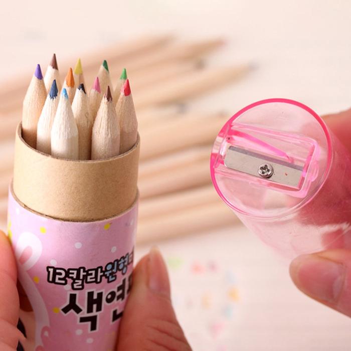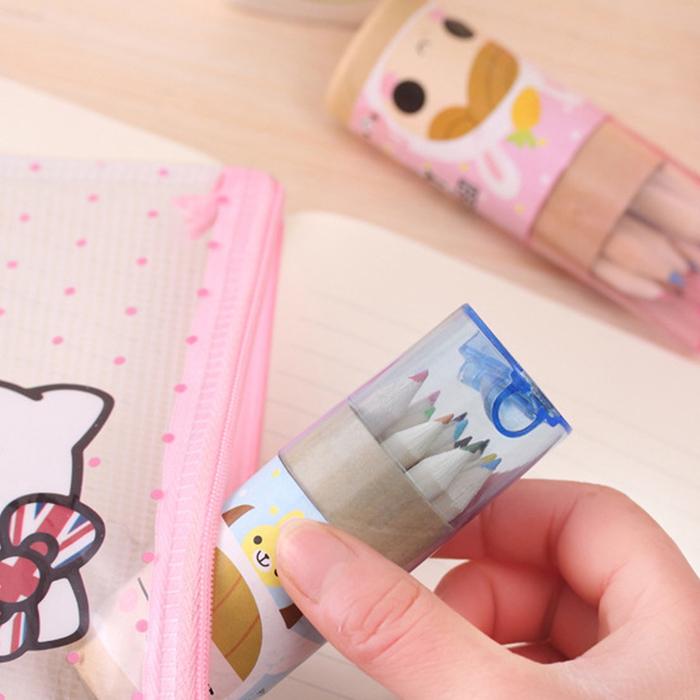 S5735 Pensil Warna Karakter Kemasan Tabung Murah Import 12 IN 1 Free Serutan Pensil Biru Hijau Stationery Foto Kayu - R