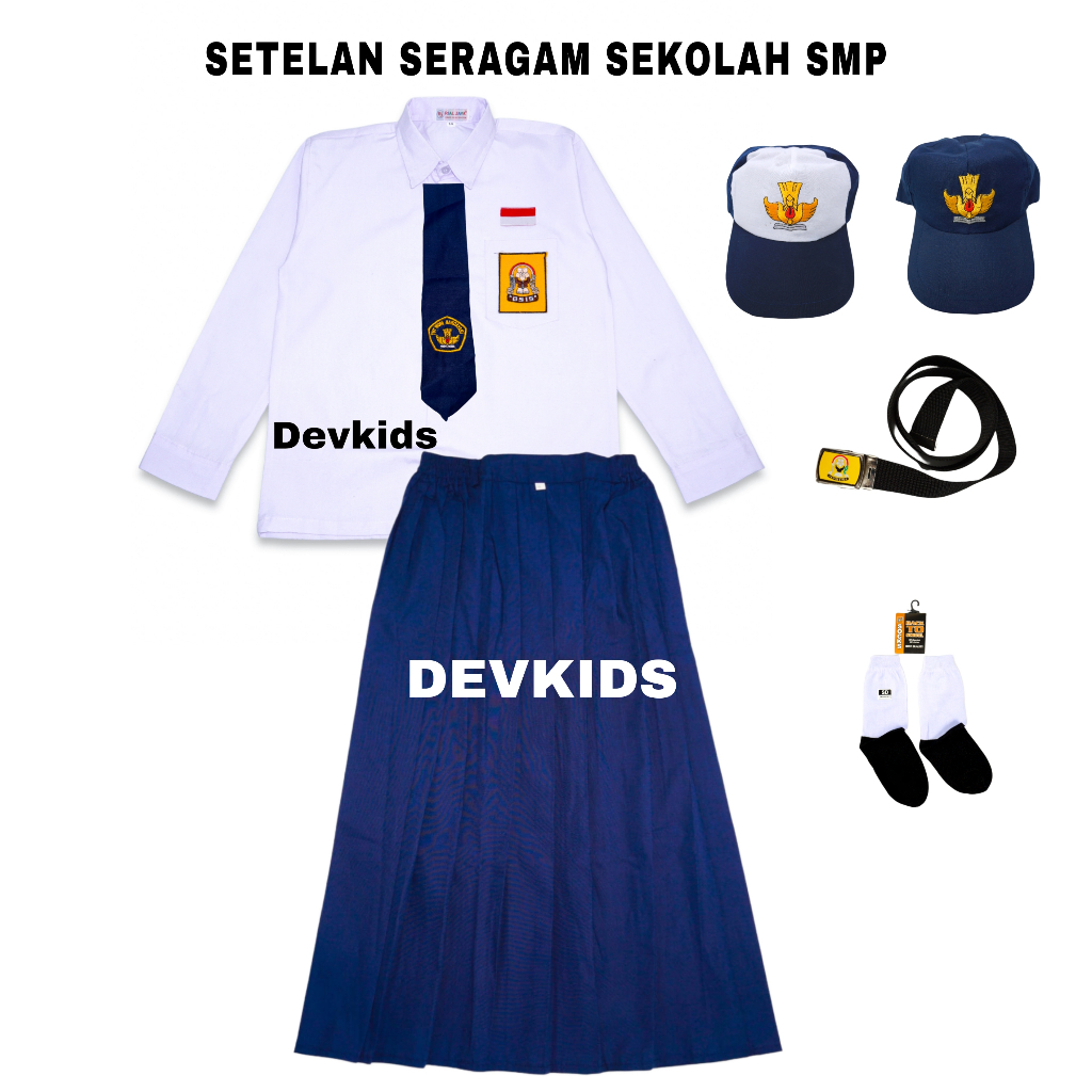 Setelan Seragam Sekolah SMP Biru Putih Perempuan Baju Putih Lengan Panjang Rok Biru Panjang