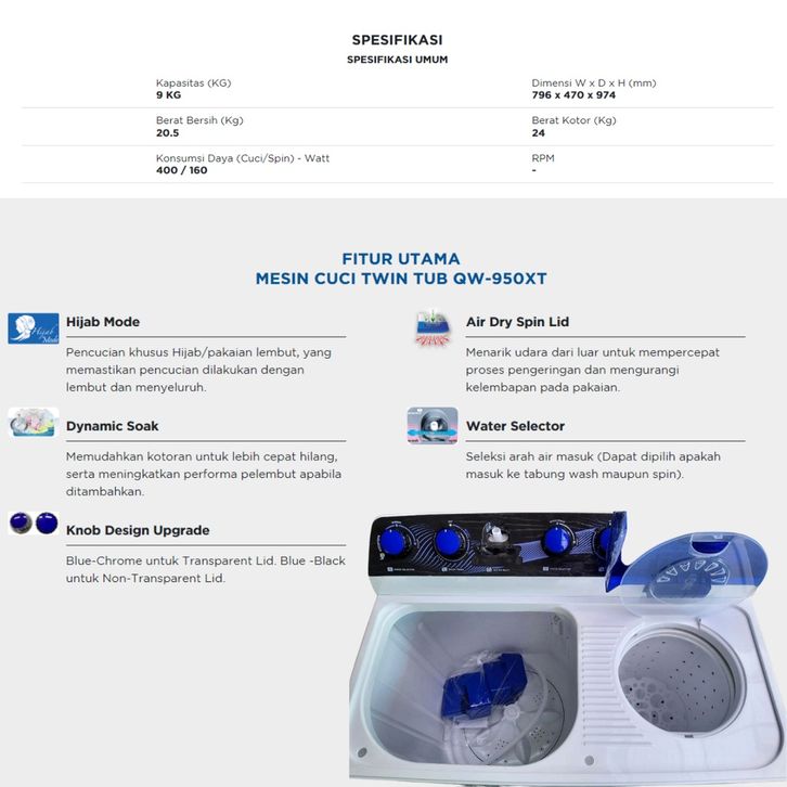 AQUA Mesin Cuci 2 Tabung QW-950XT Kapasitas 9 kg Washing Machine Twin Tub Garansi Resmi