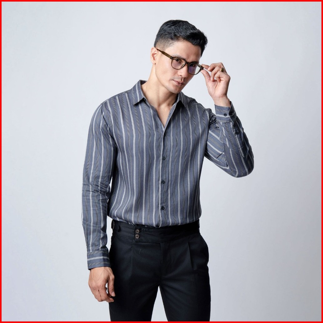 Vengoz Kemeja Pria Slim Fit - Virgo Stripe Shirt Grey Ls
