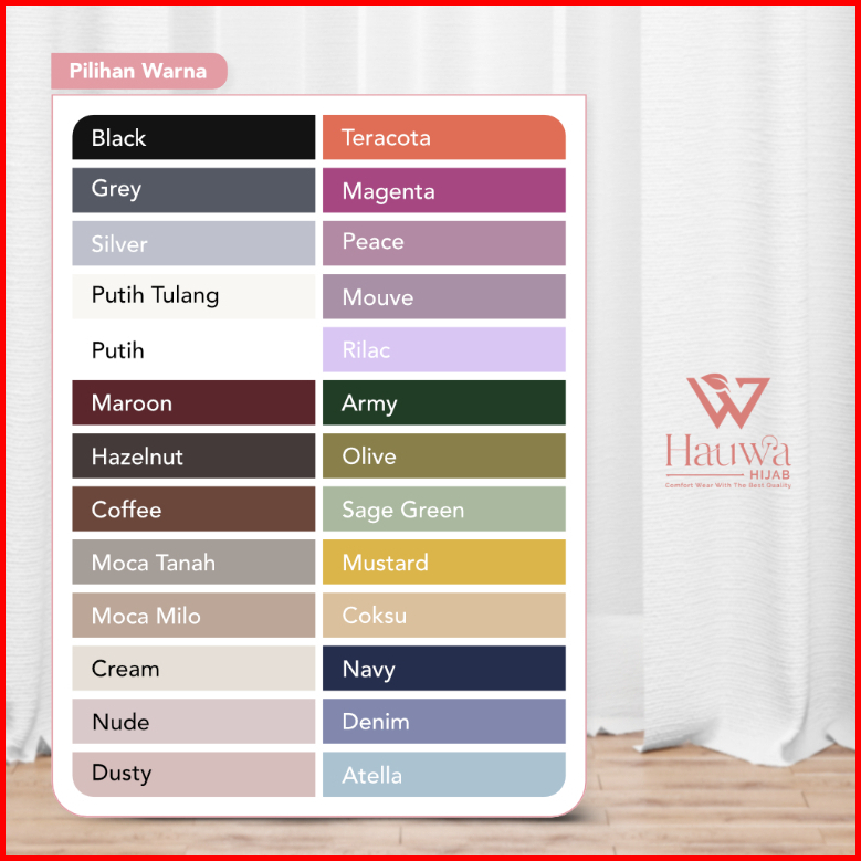 Tanah, Moca Milo, Coksu, Cream, Nude, Dusty Pink, Hitam, Coffe | Brown, Maroon, Navy, Stella, Sage, Army, Denim, Mahogany, Abu Muda | Silver, Abu Tua | Grey, Putih Bersih, BW, Burgundy